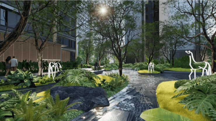 在招商时代公园,参与建筑间生长的点状公园。首先,充分的利用城市土地间的“金角银边”规划社交场景公园,让公园城市更具社交属性;其次,充分注重住宅及产业园区内的园林打造,让宅间公园根植于生活肌理。
