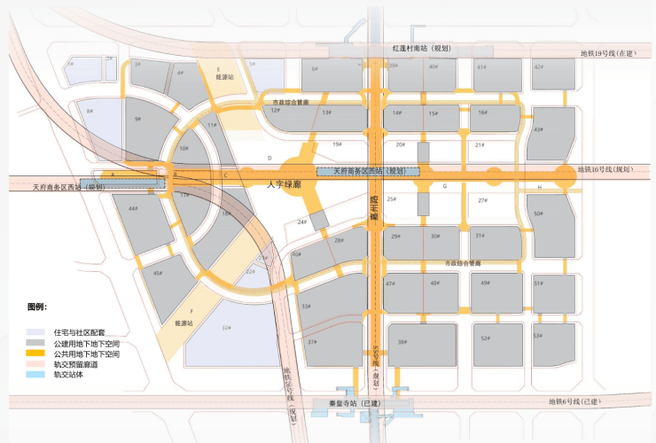 地下加密:在轨交站点、区域地标及商业中心间的主体步行空间设置了活力商业广场,布局文化、休闲、展示等公共服务功能;同时依托轨道客流构架慢行主线,以及地下独立车行系统及各物业单元的地下大堂、地下停车场系统互通互联,并通过简洁导引系统加强完善交通。